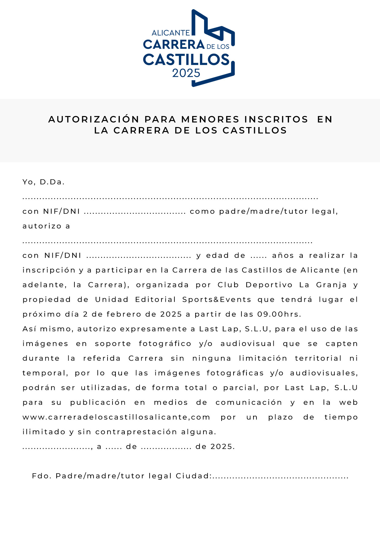 Los participantes menores de 18 años deberán presentar una autorización paterna para poder disputar la prueba. Dicha autorización podrá ser descargada aquí.